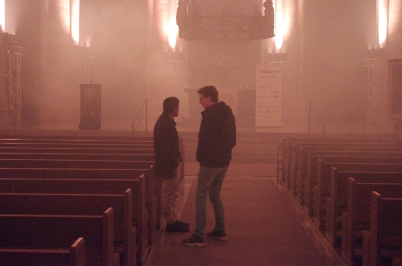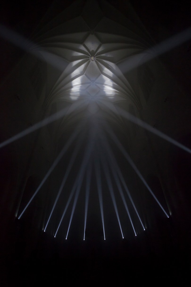 Narrow beams of apparently massive light, moving in both horizontal and vertical directions, reflect through the space. They trace the architectural structure of the church to explore and reveal its beautiful spatial qualities in various patterns. From total chaos to hyper-structuring, the installation creates a distorted perception of space and time to become an immersive, multi-sensory environment in which visitors can linger.