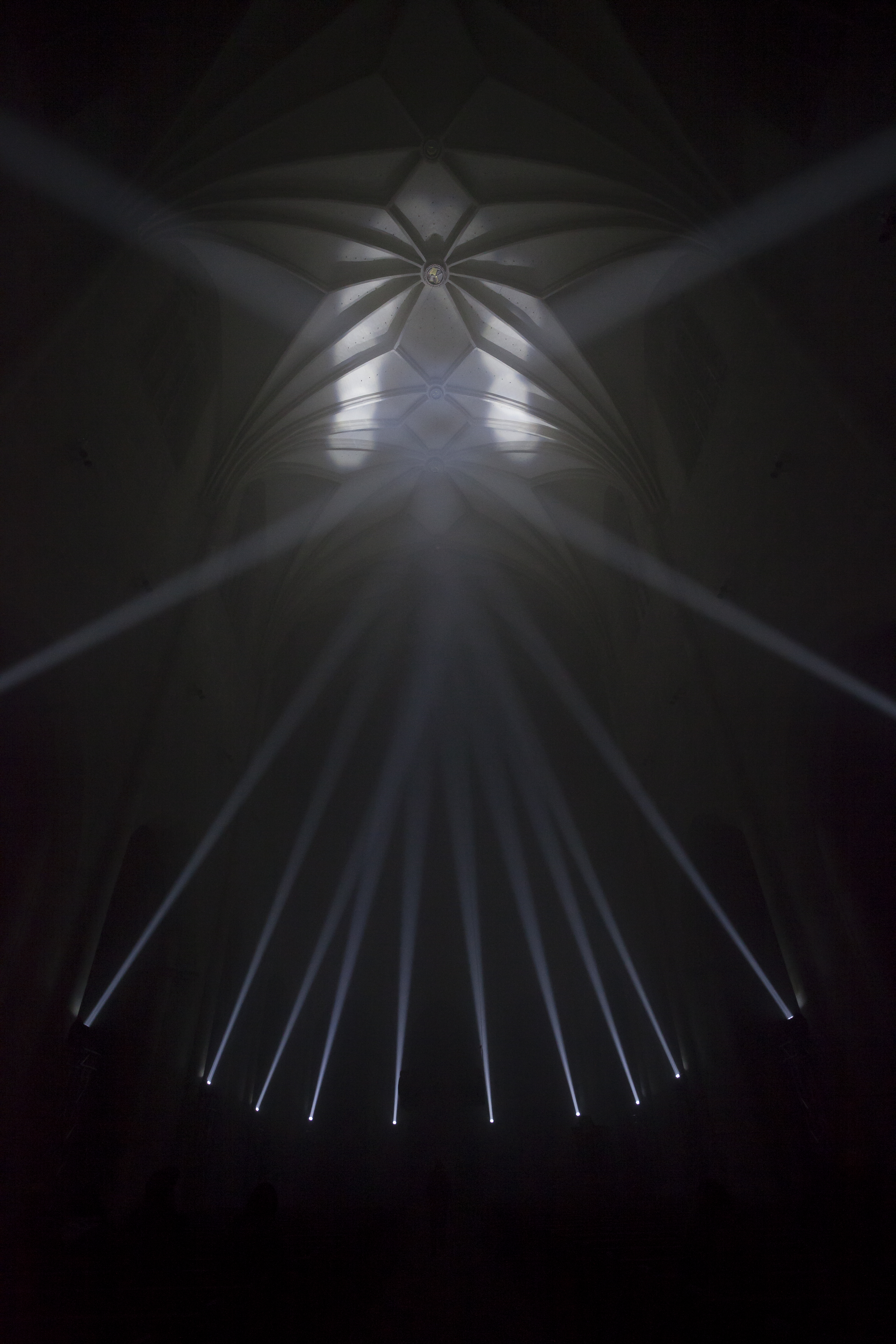 Narrow beams of apparently massive light, moving in both horizontal and vertical directions, reflect through the space. They trace the architectural structure of the church to explore and reveal its beautiful spatial qualities in various patterns. From total chaos to hyper-structuring, the installation creates a distorted perception of space and time to become an immersive, multi-sensory environment in which visitors can linger.